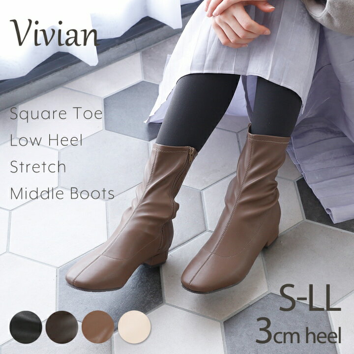 【最大20%OFFクーポン配布中】【送料無料】Vivian ブーツ レディース ストレッチ ミドル ショート ローヒール スクエアトゥ 歩きやすい 痛くない 大きいサイズ 小さい ブラック 黒 ブラウン アイボリー グレージュ