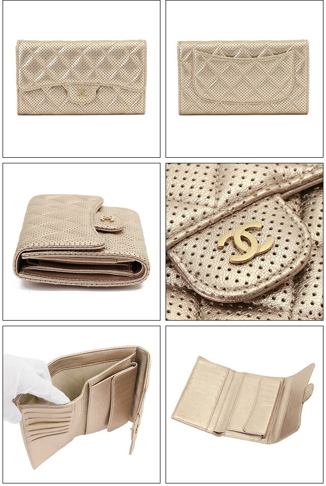 ■ 専用保存箱 ■ 専用保存袋 ■ ケアカード ■ コントロールカード ▼この財布の特徴は シャンパンゴールドの輝きがとっても高級感あふれる、CHANELの3つ折り長財布。