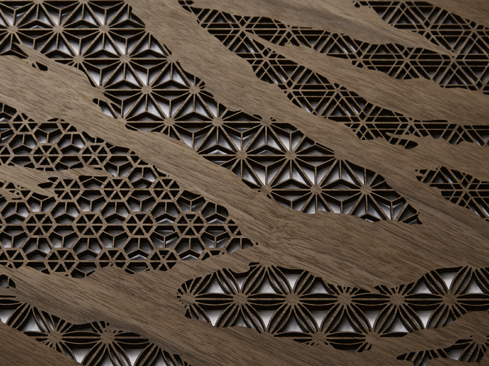 この1枚であなたのお部屋をパワースポットに!! レーザー加工でさらに細かい繊細な組子模様に挑戦しました! 元祖、迷彩組子より だいぶ小さいサイズになっておりますが、ちゃんと5種類の組子模様は入っております!ポスターサイズA3で小さめにつくっています。