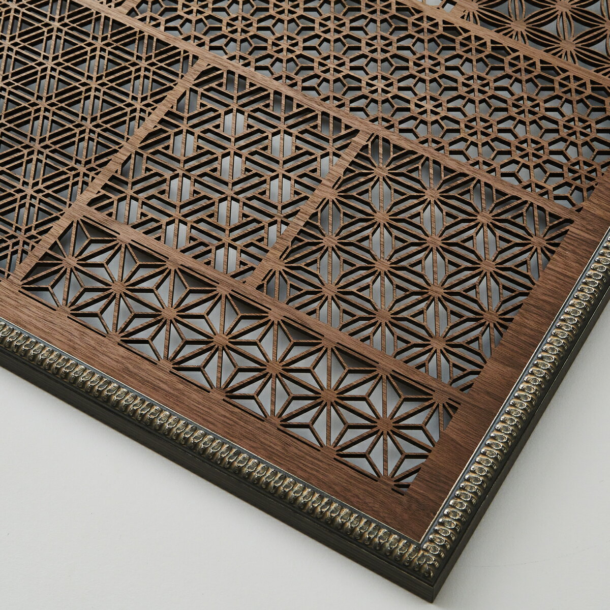 以前より額縁に入れたいと言われるお客様が多かったので、額縁店様にご協力頂き今回、額縁タイプの完成となりました!ウォールアートに直接額縁がついております 裏はふさがないので組子模様が引き立ちます裏面はティーズハンガー仕様になっておりますので、ヒモをつけてかけれますなお、縦と横に金具がついておりますので、縦にも横にも飾れます(^^♪