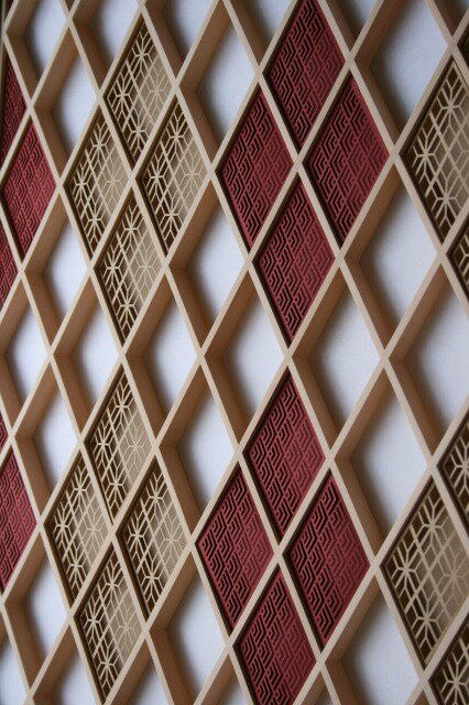 菱柄の組子に梨地の金の麻の葉を切り絵柄の小紋にして配置しています。
