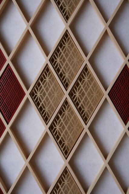 障子の白と木材のベージュのみだった組子の世界に色彩を添えてお届けします。